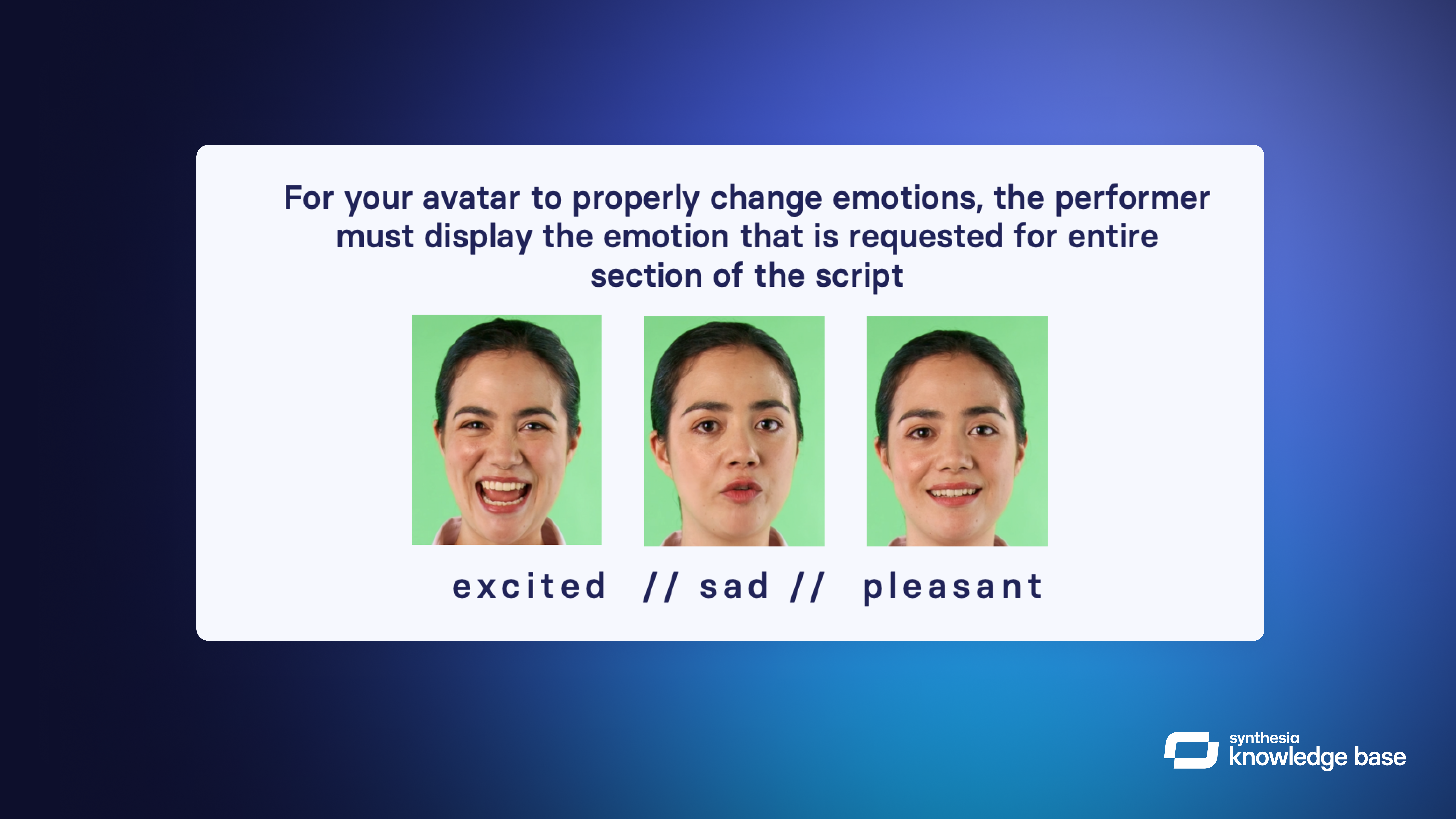 Note: Each performance should follow the same emotional direction. The digital spokesperson will mimic the performance – if the performance is not expressive or emotional enough, this will be reflected in the digital spokesperson.